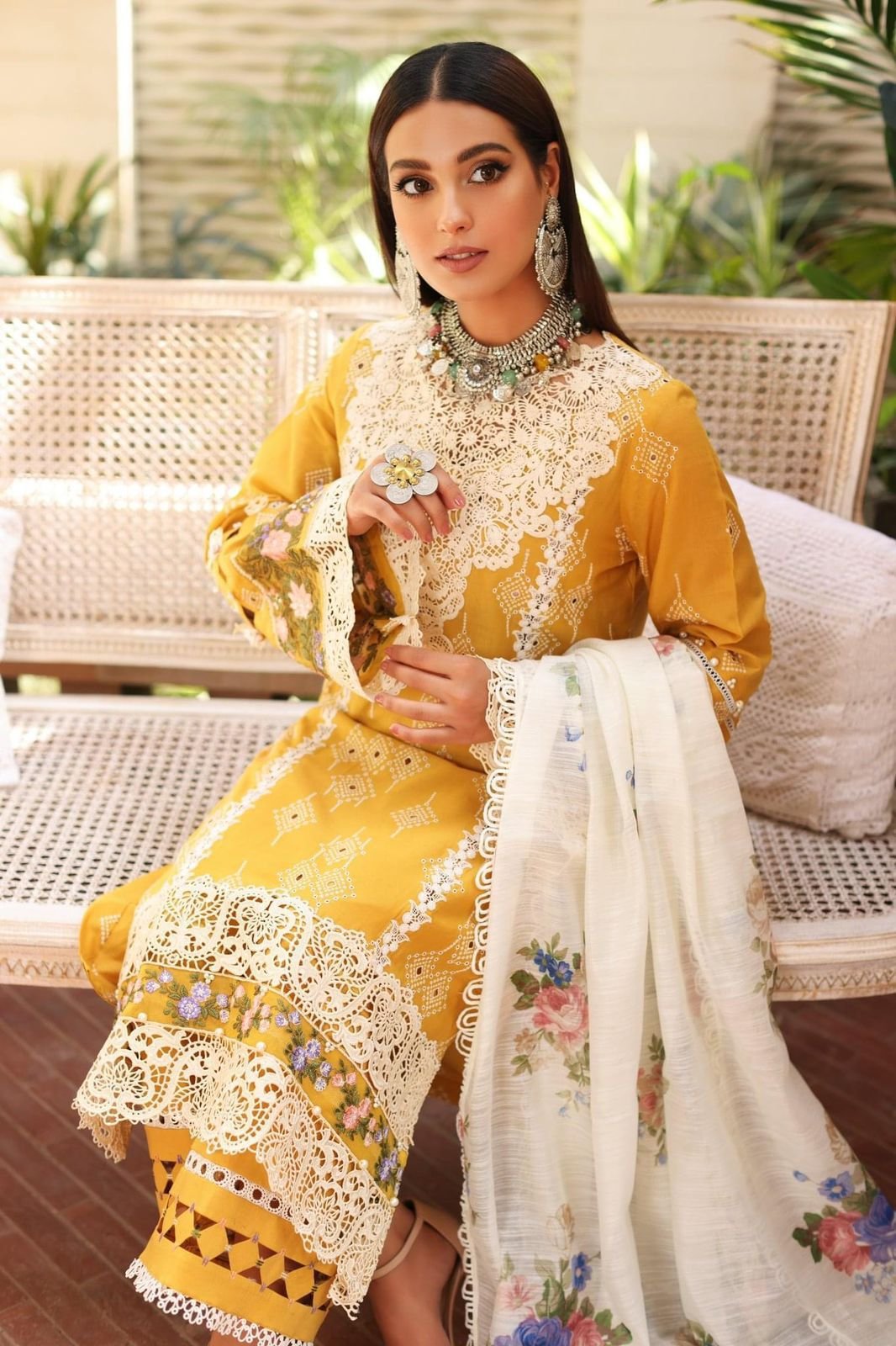 An elegant mustard yellow embroidered 3-piece suit featuring intricate lace detailing, floral embellishments, and a digitally printed white dupatta. A perfect choice for festive and formal occasions.